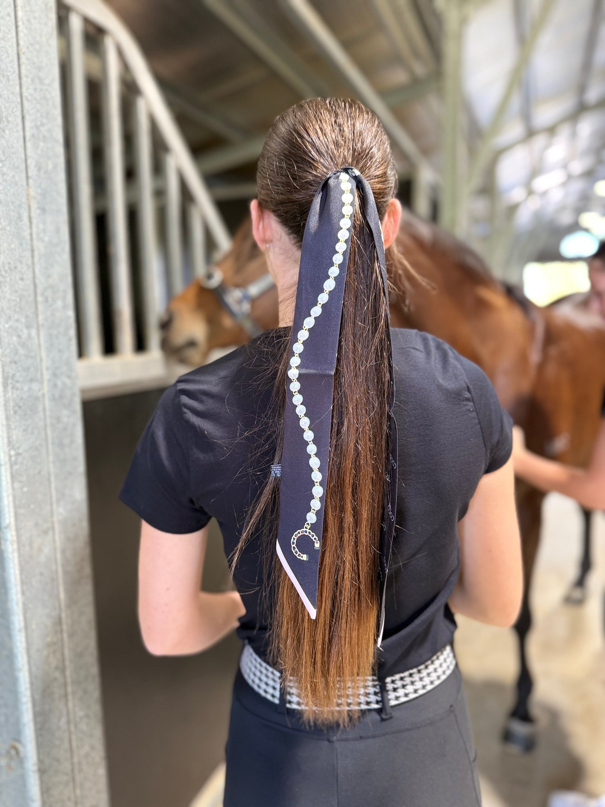 Ride in style with our horse-themed hair tie. Stay stylish while keeping your hair securely in place. Whether you're out riding or just need a simple accessory, our hair tie will add a touch of equestrian charm to your look. Made with durable materials for long-lasting wear.